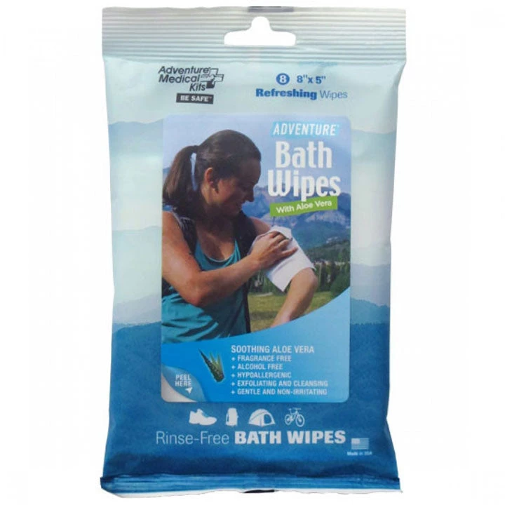 Adventure® Bath Wipes feature thick, soft and gentle pre-moistened towels to clean, disinfect, and deodorize the body. Each wipe contains a unique formula that includes Aloe Vera, Vitamin E and Witch Hazel Astrigent that will leave skin feeling refreshed and moisturized. Adventure Bath Wipes are great for camping, backpacking, hiking, bike riding, and all other outdoor activities. 8, 8″ x 5″ wipes per package.