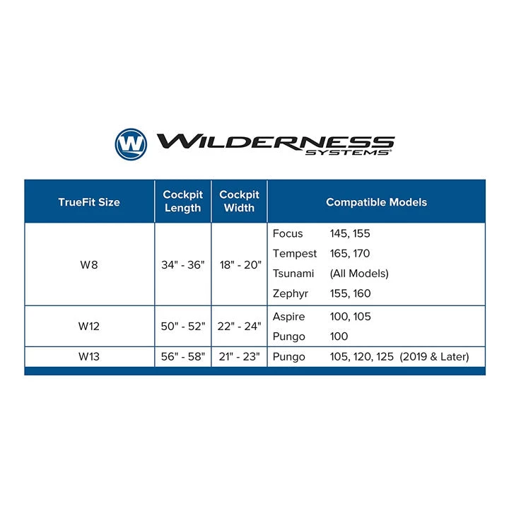 The best fitting and driest cockpit cover for your Wilderness Systems kayak as well as other kayaks. Determining the best fit for your kayak has never been easier. Size information on all Wilderness Systems kayaks identifies the TrueFit size for your kayak. No charts or measuring are required.