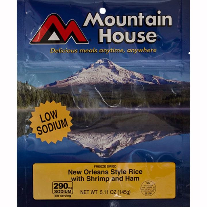Freeze Dried New Orleans Style Rice with Shrimp: Precooked Enriched Rice (enriched with niacin, iron [ferric orthophosphate], thiamine mononitrate, folic acid), Diced Tomatoes (diced tomatoes, tomato juice, salt, citric acid, calcium chloride), Shrimp (shrimp, salt) Green Bell Peppers, Onions, Celery, Black Beans (beans, salt), and Contains 2% or Less of: Seasoning (maltodexrin, dehydrated onion, dehydrated bell pepper, spices, dextrose, paprika, hydrolyzed corn protein, cayenne pepper, soy sauce [wheat, soybeans, salt], dehydrated garlic, yeast extract, salt, caramel color, soybean oil, disodium inosinate, disodium guanylate, natural flavor, extractive of paprika) Corn oil, Modified Corn Starch, Spice Extract. Freeze Dried Ham: Ham Cured with Water, Salt, Dextrose, Sodium Tripolyphosphate, Sodium Erythorbate, Smoke Flavor, and Sodium Nitrite.CONTAINS: Shrimp, Soy, Wheat.