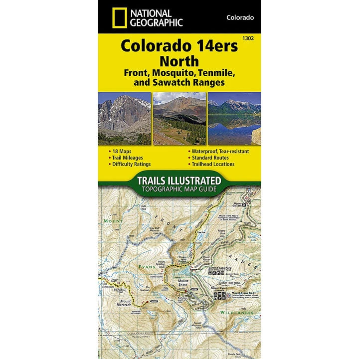 The Colorado 14ers North Topographic Map Guide provides the most accurate and convenient set of maps for the fourteeners of the Front, Mosquito, Tenmile, and Sawatch ranges of northern Colorado. Almost half of Colorado’s fourteeners fall in these ranges, but their proximity to large population centers leave no shortage of hikers on their slopes. Moderate ridges, established trails, and accessible trailheads are the norm on the standard routes, making many of these peaks relatively easy to climb. However, it’s important to note that these seemingly gentle giants also have their rugged side—including the north face of Mount Evans, the amphitheater north of Mount Democrat, Ellingwood Ridge on La Plata Peak, and the sheer east face of Longs Peak—placing them among the most challenging alpine experiences in the United States.