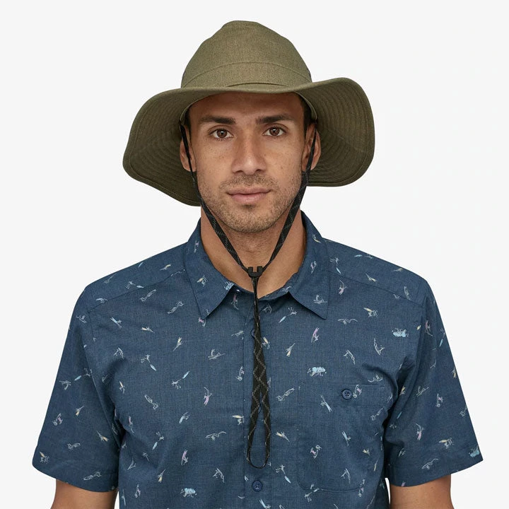 Large-brim sun protection in a light, comfortable and durable hemp/recycled polyester/organic cotton fabric blend. Fair Trade Certified™ sewn.